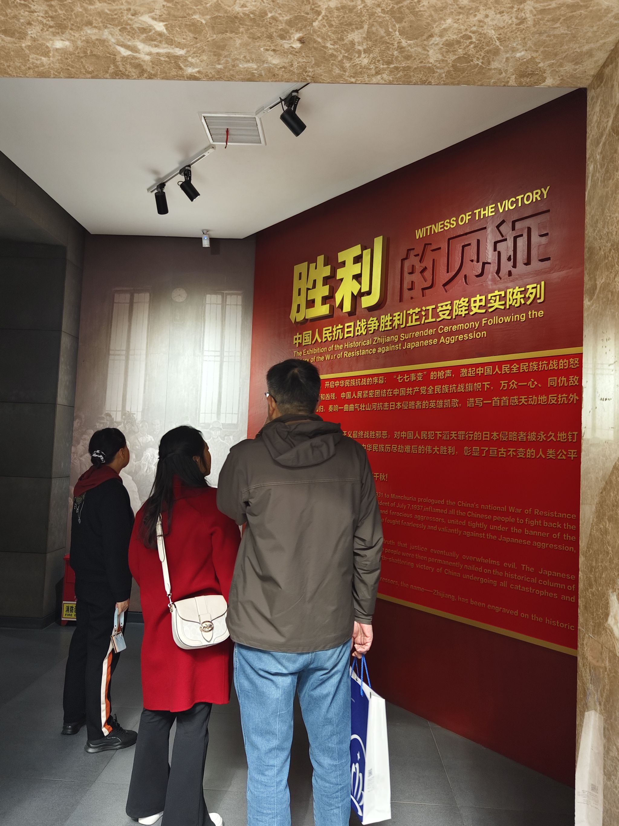 大家依次参观了凯旋门、受降纪念坊、受降堂等核心展区,通过一幅幅珍贵历史图片、装备实物以及声光电技术还原的战役场景,深刻体会了“十四年抗战”的艰辛历程。也充分体会了毛泽东在照壁上的题词“人民的胜利”。